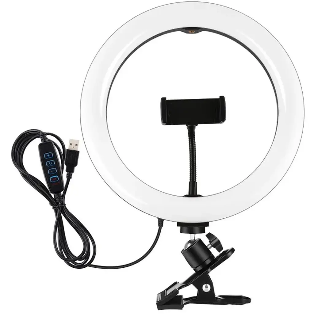Технические характеристики: Количество светодиодов: 2x60 шт. Тип светодиодов: 2835. Яркость лампы: 24-26 lm. Цветовая температура: 3200-5600K. Мощность: 0.39W-9.4W. Напряжение: 5V. 1%-100%. Материал: пластик ABS, акрил. Размеры: наружный диаметр 260 мм, внутренний диаметр 210 мм. Питание: USB. Длина кабеля: 2 м. Размер в упаковке: 300x290x90 мм. месяцев.Комплектация:Кольцевой свет.Шариковая головка штатива.Кабель USB с пультом управления.Телефонный держатель.Зажим.