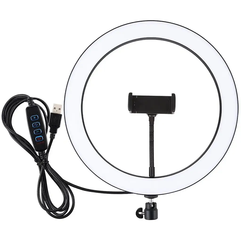 О товаре Технические характеристики: Количество светодиодов: 2*92шт. Тип светодиодов: 2835 Яркость лампы: 24-26 lm Цветовая температура белого света: 6500KТемпература теплого белого цвета: 3200KМощность: 0.9W-11W -100%Материал: пластик ABS, акрилРазмеры: наружный диаметр 300 мм, внутренний диаметр 240 ммПитание: USBДлина кабеля: 2 мИндекс цветопередачи: Ra> 90Крепление для телефона: 5,7-9 смРазмер светодиодного кольца: 30х34 упаковке: 0,65 кгГарантия: 12 месяцевКомплектация:Кольцевой свет с креплением для телефонаШарнирная головка