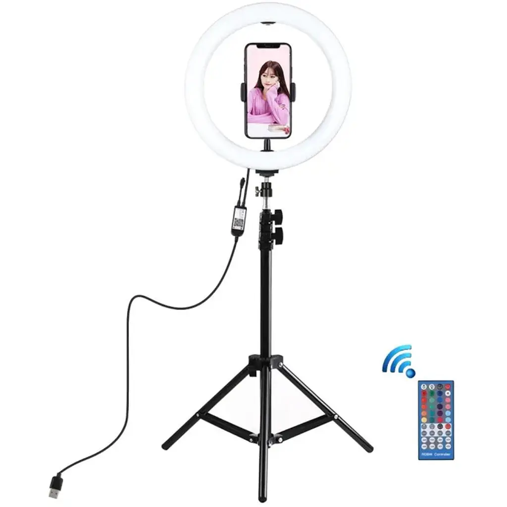 Штатив:1. Изготовлен из высококачественной алюминиевой трубки, надежен и прочен. Компактные ножки штатива можно сложить, сделав их достаточно маленькими для удобной переноски. Отрегулируйте высоту штатива, отрегулировав центральную ось в соответствии с разными концепциями съемки.4. Подходит для мобильных телефонов, планшетов, спортивных камер, DV камер и др.5. Легкий и портативный дизайн: удобно использовать для путешествий или работы на открытом воздухе и т.д.6. Высота в сложенном виде: 49,5 см; в разложенном виде: 1,1 м. Светодиодное кольцо:1. Светодиодный кольцевой светильник можно установить на держатель и взять с собой куда угодно, его можно снять со стойки в любое время, шаровая головка штатива может вращаться на 360 градусов и может свободно регулироваться под любым углом (держатель не входит в комплект).2. Кольцевой светильник изготовлен из 46 энергосберегающих светодиодов. Он отлично рассеивает тепло, обладает постоянным током и высокой цветопередачей, смягчает источник света и повышает тон кожи при съемке портретов.3. Режим RGB позволит легко настроить цвет и яркость, добиться идеальной яркости без установки дополнительных красочных фильтров. Различные цвета мягкого природного света освещают вашу красоту в разных условиях. Широкое применение: широко используется для освещения на улице, в помещении, для съемки портрета, рекламной фотографии, визажа/макияжа, съемки видео и т.д.5. Легкий и портативный дизайн: удобно использовать и носить с собой, когда вы путешествуете или работаете на улице и т.д.6. Зажим телефона подходит для мобильного телефона шириной 6-8,5 см. Технические характеристики: Светодиоды: 46 шт. SMD 5050 RGBW Мощность: 15Вт (USB 5V/3A) Режим работы: RGB + White Режимы управления: Bluetooth APP, пульт дистанционного управления Режимы дистанционного управления: 20 статических цветов и 6 динамических цветов дистанционного управления: 5-10 мМетод сигнала: инфракрасная радиочастотаЦвет:- Красный: длина волны 620-625 нм, световой поток 600 мкд/лм- Зеленый: длина волны 520-525 нм, 10 длина волны 460-465 нм, световой поток 400 мкд/лм- Белый: цветная температура 6000-6500k Размер светодиодного кольца: 26х26 см (26х35 см с креплением) креплением для телефонаШтативПульт дистанционного управления