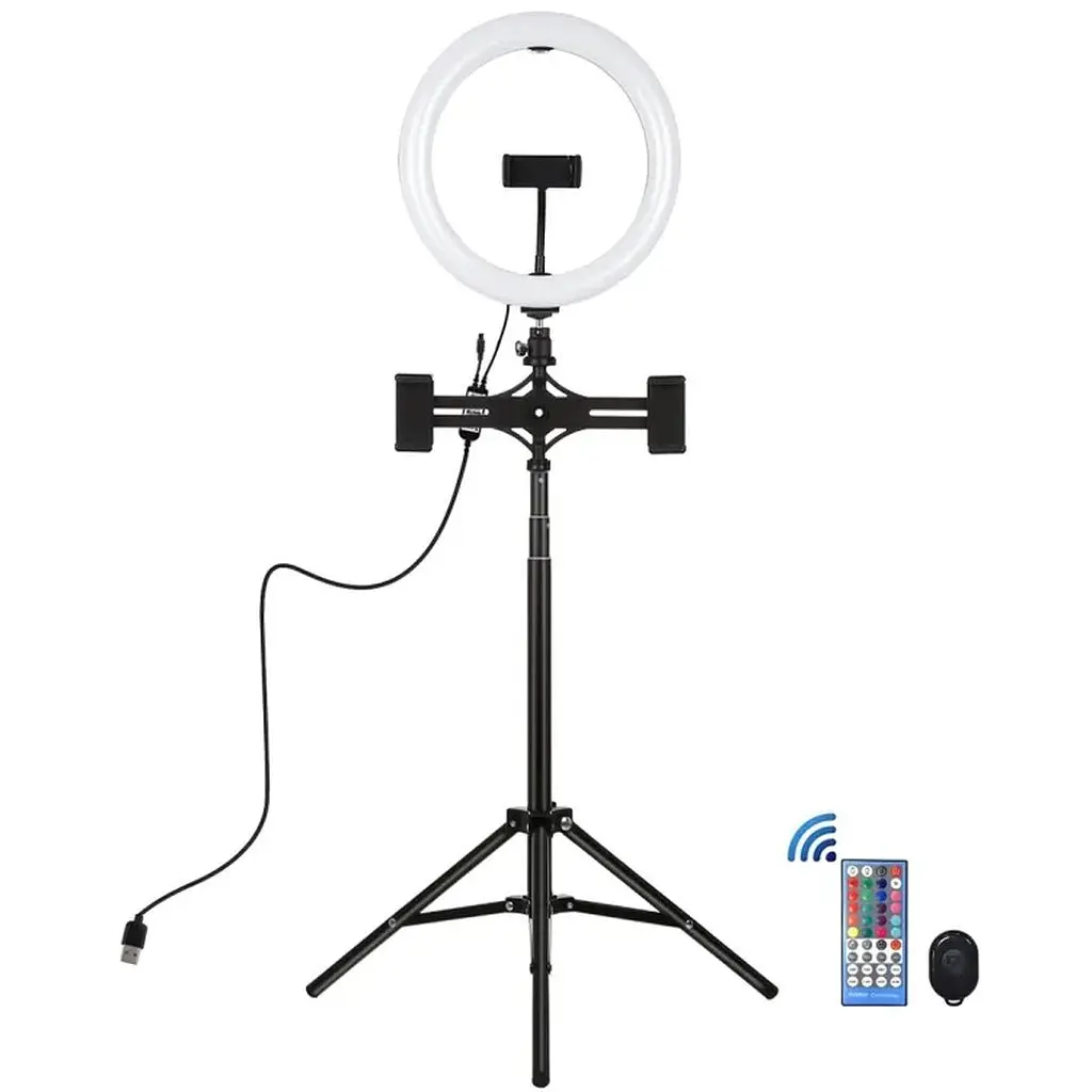 Штатив:1. Изготовлен из высококачественной алюминиевой трубки, надежен и прочен. Компактные ножки штатива можно сложить, сделав их достаточно маленькими для удобной переноски. Отрегулируйте высоту штатива, отрегулировав центральную ось в соответствии с разными концепциями съемки.4. Подходит для мобильных телефонов, планшетов, спортивных камер, DV камер и др.5. Легкий и портативный дизайн: удобно использовать для путешествий или работы на открытом воздухе и т.д. Регулируемая максимальная высота: 165 см, высота в разложенном виде: 170 см, высота в сложенном виде: 37 см.7. Вес: 486 гСветодиодное кольцо:1. Светодиодный кольцевой светильник можно установить на держатель и взять с собой куда угодно, его можно снять со стойки в любое время, шаровая головка штатива может вращаться на 360 градусов и может свободно регулироваться под любым углом (держатель не входит в комплект).2. Кольцевой светильник изготовлен из 46 энергосберегающих светодиодов. Он отлично рассеивает тепло, обладает постоянным током и высокой цветопередачей, смягчает источник света и повышает тон кожи при съемке портретов.3. Режим RGB позволит легко настроить цвет и яркость, добиться идеальной яркости без установки дополнительных красочных фильтров. Различные цвета мягкого природного света освещают вашу красоту в разных условиях. Широкое применение: широко используется для освещения на улице, в помещении, для съемки портрета, рекламной фотографии, визажа/макияжа, съемки видео и т.д.5. Легкий и портативный дизайн: удобно использовать и носить с собой, когда вы путешествуете или работаете на улице и т.д.6. Зажим телефона подходит для мобильного телефона шириной 6-8,5 см. Технические характеристики: Светодиоды: 46 шт. SMD 5050 RGBWМощность: 15Вт (USB 5V/3A)Режим работы: RGB + WhiteРежимы управления: Bluetooth APP, пульт дистанционного управленияРежимы дистанционного управления: 20 статических цветов и 6 динамических цветовРежим работы с ПО: режим настройки цвета дистанционного управления: 5-10 мМетод сигнала: инфракрасная радиочастотаЦвет:- Красный: длина волны 620-625 нм, световой поток 600 мкд/лм- Зеленый: длина волны 520-525 нм, 10 длина волны 460-465 нм, световой поток 400 мкд/лм- Белый: цветная температура 6000-6500k Размер светодиодного кольца: 26х26 см (26х31 см с креплением) креплением для телефонаДвойной крепеж для телефоновШтативПульт дистанционного управления