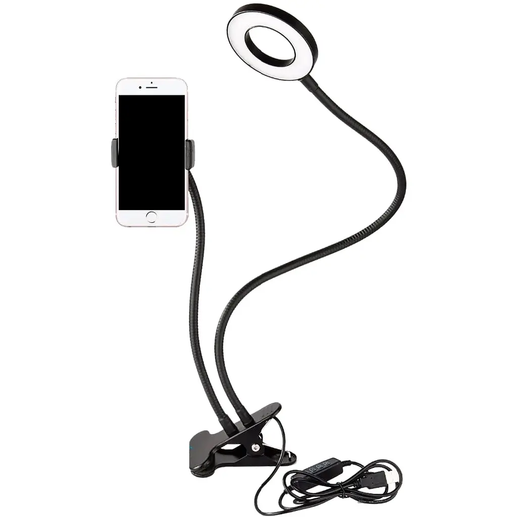 Набор блогера позволяет решить сразу несколько задач: удержание телефона и устранение недостаточного освещения при записи видео. Благодаря своей конструкции данный комплект можно применять не только в блогерском ремесле, но и в повседневном использовании, например на рабочем месте или в качестве ночного светильника.