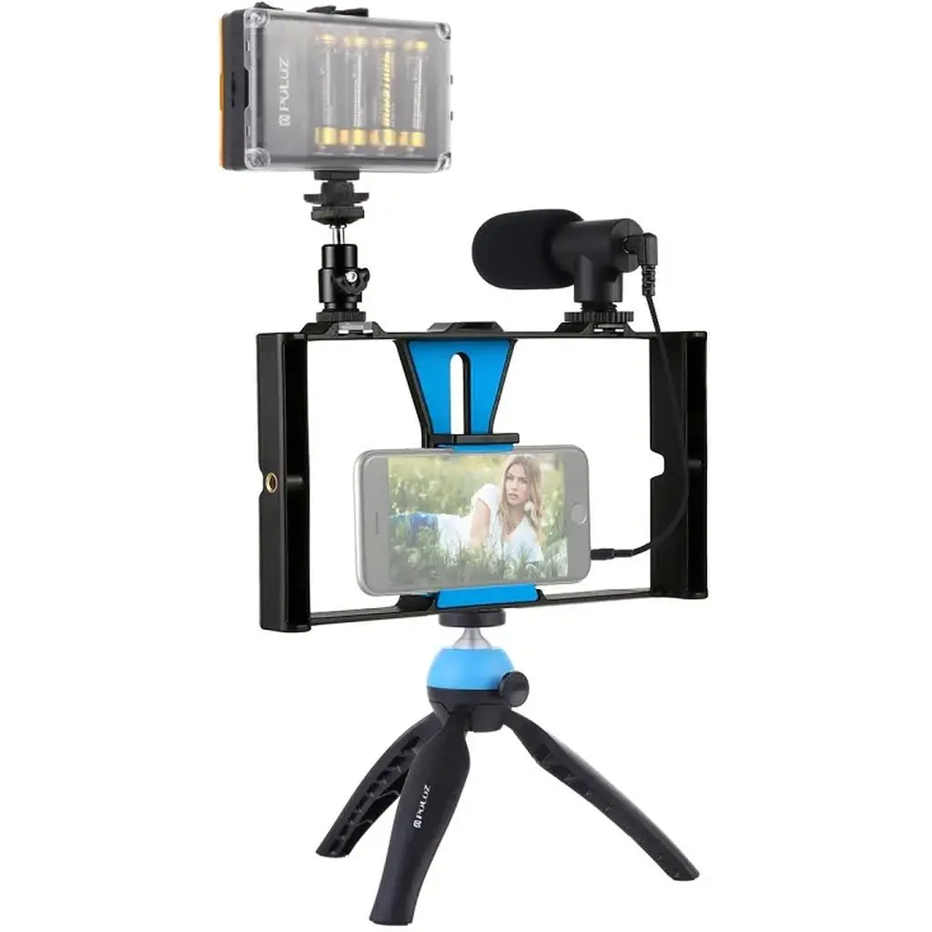 Комплект блоггера Puluz PKT3025L 4в1 (постоянный свет, штативный крепеж, держатель для телефона, микрофон)Студийный свет1. Это профессиональный светодиодный светильник для видеокамеры. Мини-дизайн позволяет легко переносить в кармане.3. Поддержка 4 батареек типа АА (батарейки в комплект не входят), что делает его более удобным в использовании.4. Поддержка внешнего источника питания (порт Type-C), подходит для продолжительного использования.5. Встроенные 104 светодиодных элемента высокого качества.6. Вращая переключатель, можно отрегулировать яркость без фильтрующих пластин, что подходит для разных условий фотографии.7. Высокоэффективный, энергосберегающий, низкое энергопотребление.8. 9. Можно закрепить в гнезде горячего ботинка камеры, использовать на профессиональной легкой рамке или штативе камеры. С двойным гнездом холодного ботинка, можно установить микрофоны или мобильный телефон.10. С винтом 1/4 дюйма для Canon, Nikon, Sony и других видеокамер. Кроме того, его можно использовать на штативе 1/4 дюйма. Микрофон1. Стереосистема MS обеспечивает получение природного звука с превосходной четкостью2. Сопротивление нагрузке: <0,68 кОм3. Подходит для любого устройства с разъемом для микрофона 3,5 мм и горячим башмаком, подходит для телефонов с разъемом 3,5 мм4. Тип микрофона: конденсаторный электретный микрофон5. Размеры микрофона: 14*6,5 мм6. Направленность: одна точка7. Частотный диапазон: 20–20000 Гц8. Чувствительность: -42 дБ +/- 3 дБ (0 дБ = 1 В/Па).9. Соотношение сигнал/шум: >65 дБ SPL10. Напряжение: 1,5 ВПриспособление для видеоблога1. Это незаменимая вещь для вас, если вы любите записывать видео высокого качества. Установка значительно упрощает съемку видео, так как у вас гораздо лучшее увлечение двумя руками.2. Незаменимый аксессуар для всех, кто хочет улучшить свои навыки кинопроизводства с помощью телефона, который снимает изображение лучше, чем многие камеры высокого класса.3. Совместимость с iPhone 8 Plus, iPhone X, Samsung, большинством смартфонов Huawei. Крепление для мини-штатива1. Легкий и портативный дизайн всего 150 г2. Изготовлен из толстого и прочного пластика, идеально подходит для съемки динамических спортивных соревнований под фиксированным углом, но также может использоваться в качестве рукоятки для съемки видео или фотографий с помощью GoPro, компактной камеры или смартфона.3. Новый кнопочный механизм позволяет позиционировать и фиксировать шаровую головку одним быстрым и интуитивно понятным движением. Эта прочная конструкция обеспечивает надежную базу в любой ситуации, а резиновые ножки гарантируют стойкость и отсутствие скольжения на любой поверхности. Универсальный винт 1/4 дюйма совместим с компактными камерами Canon/Nikon/Sony/Pentax и другими легкими зеркальными фотокамерами с резьбой 1/4 дюйма; подходит для GoPro 5/4/3+, iPhone, Galaxy, Huawei, Haweel и других смартфонов.6. Максимальная нагрузка: 1 кг. Размер: 17.3*5.5*4.3 см. Характеристики: Материал: PC, ABS Размер гнезда: 1/4" Размер: 25х13х4 см Вес: 164 гTHD <= 1% крепление дополнительных аксессуаров.Вес в упаковке: 0,73 кг