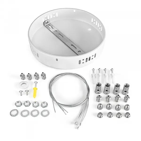 Комплект креплений с фурнитурой для подвесного монтажа светодиодной панели. Включает в себя 4 троса длиной 600 мм и основу диаметром 200 мм и высотой 40 мм. Материал: алюминий.