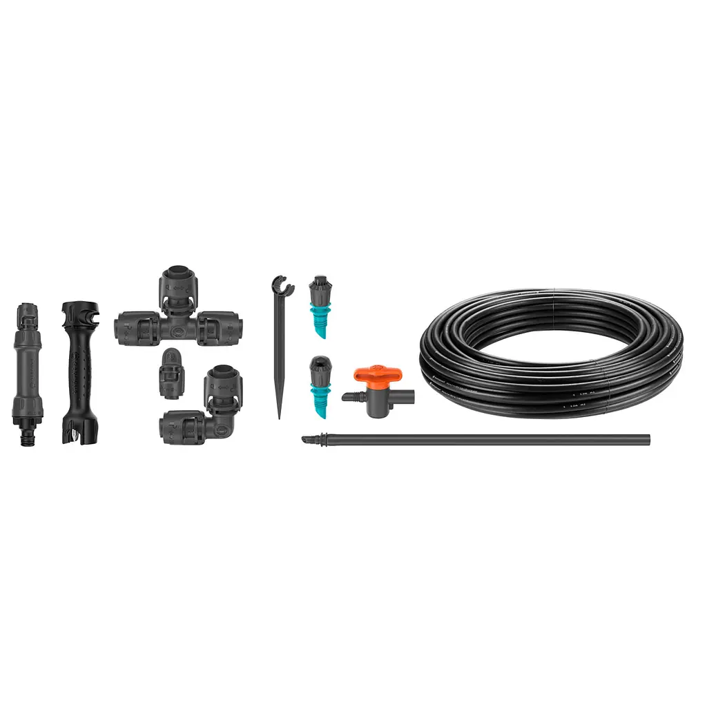 Комплект Gardena Micro-Drip-System обеспечивает микрокапельное орошение для грядок и клумб площадью до 60 м² путем мелкодисперсного распыления тумана. Это экономит воду и время, обеспечивая растениям оптимальный уход.