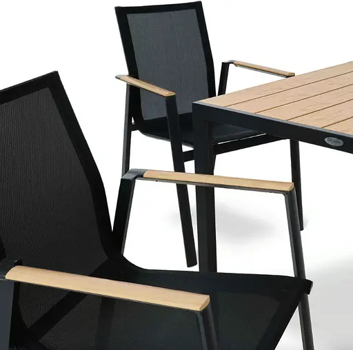 Стулья Cremo в комплекте обеспечивают комфортный отдых благодаря своей эргономичной форме и использованию тщательно подобранных материалов. Сиденье и спинка из ткани Textilene черного цвета удобны и достаточно гибкие, чтобы адаптироваться к форме тела сидящего человека, но не растягивается и не деформируется в результате использования. Сетчатая структура ткани делает ее воздушной, приятной на ощупь и не впитывает влагу. Легкая алюминиевая рама с порошковым покрытием гарантирует прочность и устойчивость конструкции. Однородный цвет стульев нарушают подлокотники из полиэстера контрастного, светлого цвета, создавая естественный цветовой и материальный акцент.