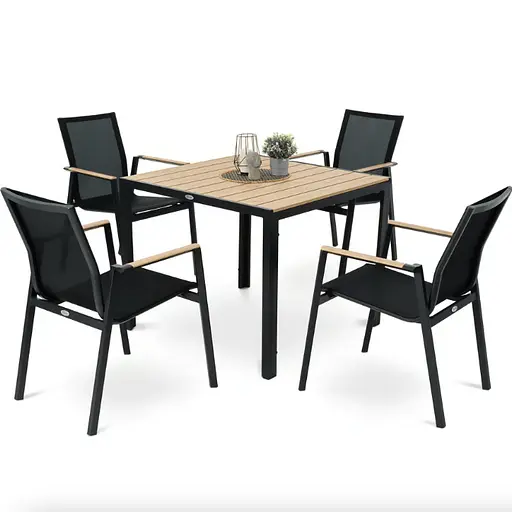 Четырехместный комплект садовой мебели Cremo от Di Volio позволит вам создать комфортное и стильное пространство для отдыха и обеда на свежем воздухе. Набор состоит из квадратного стола с деревянной столешницей и четырех стульев с практичными подлокотниками. Мебель характеризуется аккуратными размерами, что делает набор Cremo превосходным выбором как для больших, так и для меньших садов или террас. Благодаря использованию прочных материалов мебель не портится, не трескается и не теряет цвет в течение многих лет использования, даже подвергаясь различным погодным условиям. Современный дизайн мебели, сочетающий простые формы и цвета, ограниченные матовым черным и натуральным бежевым, придает мебели элегантный вид и универсальный характер, благодаря чему она может стать отличной основой для любого обустройства внешнего пространства дома, независимо от его стиля.