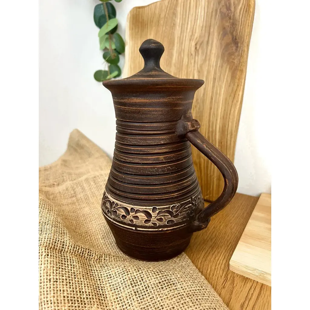 Этот компотник сочетает в себе эстетику народной керамики и практичность. Благодаря глиняной структуре напитки дольше остаются свежими, а ангобинг добавляет контрастный рисунок, который подчеркивает уникальность изделия. Удобная ручка обеспечивает комфорт в использовании, а крышка защищает содержимое от посторонних запахов.