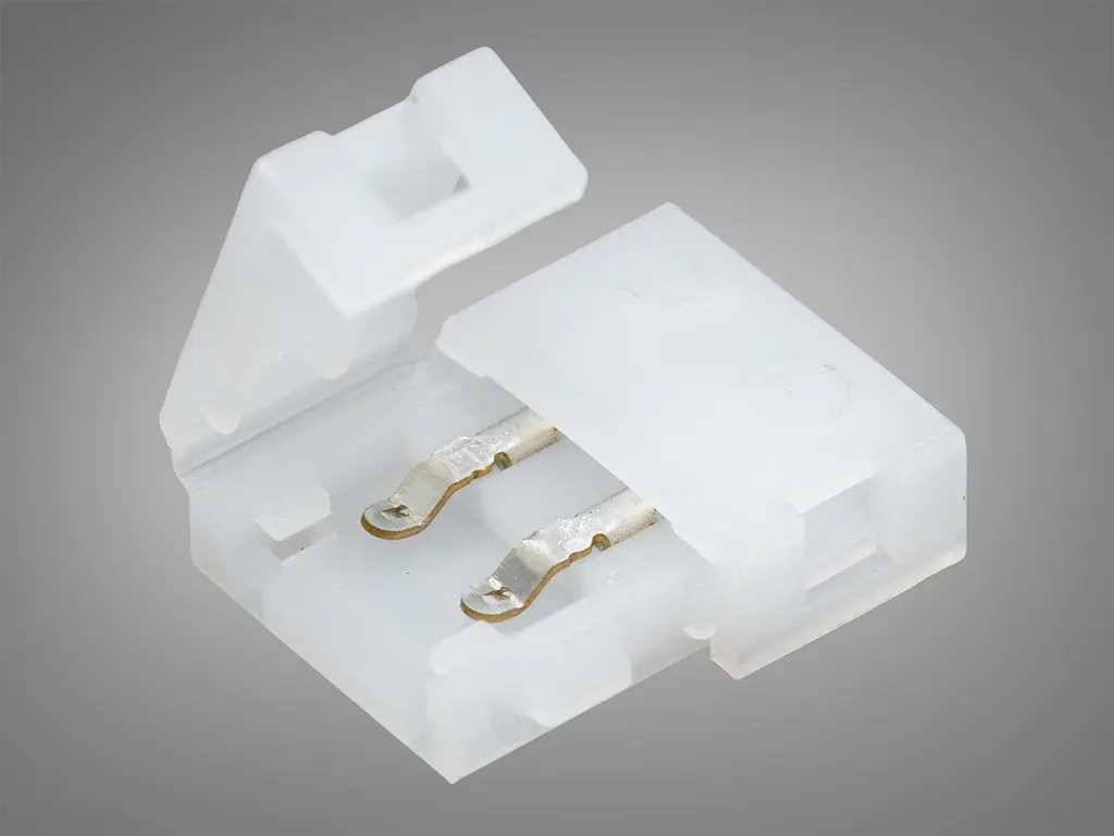 Коннектор для LED ленты 2-pin (контакты), шириной 8 мм, пружинный контакт. Надежный и компактный коннектор для светодиодной ленты на 2 контакта (2-pin) предназначен для соединения монохромных LED лент шириной 8 мм. Его главное преимущество – пружинный контакт, позволяющий выполнить монтаж без пайки, инструментов или сложных манипуляций.