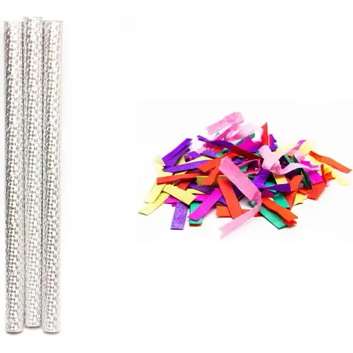 Стик имеет плотный корпус, выполненный в серебристом цвете с голографическим эффектом, который дополнительно подчеркивает торжественность момента. Внутри содержится разноцветное конфетти в виде ярких лент, которые эффектно разлетаются после активации. Для запуска достаточно слегка нажать на корпус или встряхнуть, в зависимости от типа конструкции.