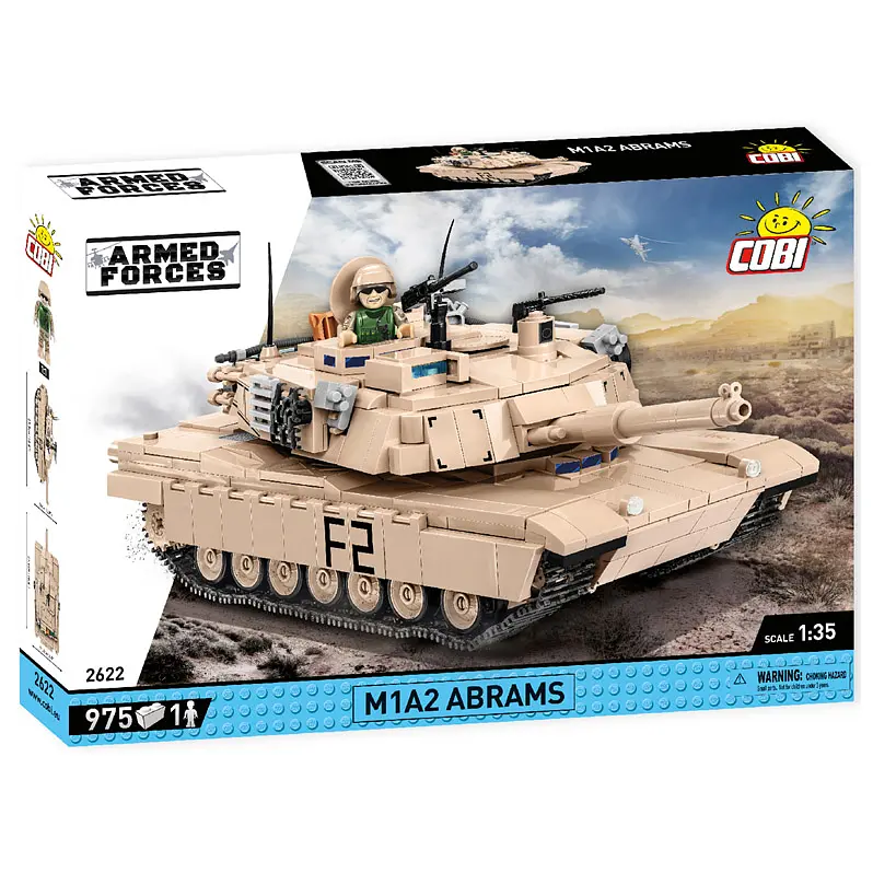 Конструктор Cobi позволяет построить танк Abrams в версии M1A2, разработанный по лицензии General Dynamics Land Systems. Макет был воспроизведен в масштабе 1:35. Последняя версия этого танка еще более детализирована. Это стало возможным благодаря использованию новых блоков из постоянно растущего каталога элементов, созданного Cobi. Модель имеет только качественные принты, которые не стираются при использовании. Машина имеет рабочие гусеницы и открываются люки для размещения экипажа. Башня и ствол машины подвижны. Под съемным служебным люком расположен двигатель. Танк "Абрамс" пополнился такими аксессуарами, как запасные гусеницы, боеприпасы и два пулемета.