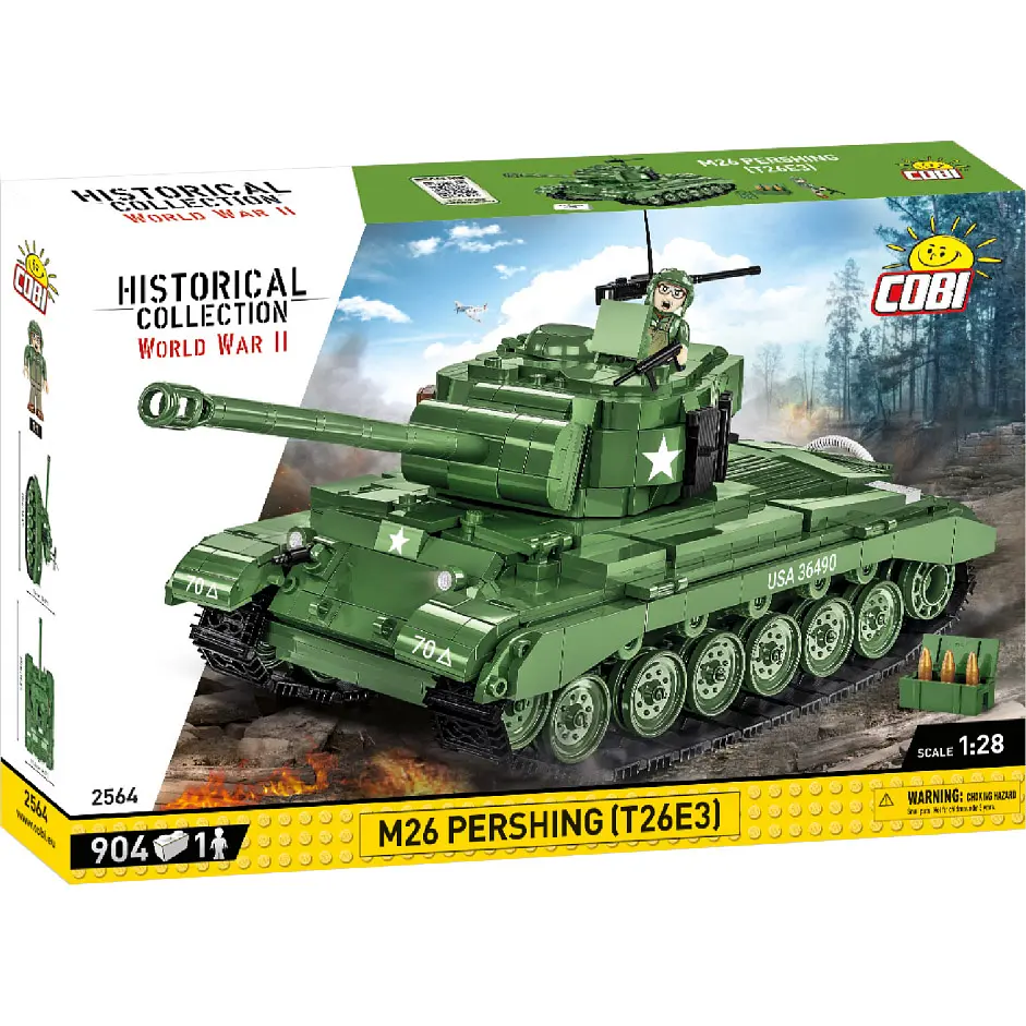 Конструктор Cobi воспроизводит американский танк Pershing, поставлявшийся в войска в последние месяцы Второй мировой войны и отличавшийся высокой эффективностью. В основном танки попали в армию генерала Паттона. Производство танков началось в 1944 году и продолжалось до следующего года. Было выпущено около 2200 экземпляров. Танк оснащался броней толщиной до 102 мм и эффективной 90-мм пушкой М3. Окончание второй мировой войны не означало прекращения использования этой модели. Вновь танки пошли в бой во время Корейской войны 1950-1953 годов. Набор был тщательно разработан в масштабе 1:28 с использованием 904 строительных кирпичиков Cobi. Модель танка имеет подвижные элементы, такие как: рабочая гусеничная тяга, вращающиеся колеса, ствол опускающейся пушки, опускающаяся башня, вращающаяся башня, открывающиеся люки и люк обслуживания двигателя. В набор входит новая фигурка танкиста. Блоки и фигурка покрыты качественными принтами, не стираются при интенсивном использовании. Весь комплект завершает табличка под названием модели. Благодаря простой и понятной инструкции набор легко собирать. Реалистичная блочная модель обязательно привлечет внимание не только взрослых, но и юных любителей истории и военной техники. Это идеальное дополнение к исторической коллекции Cobi, посвященной Второй мировой войне.