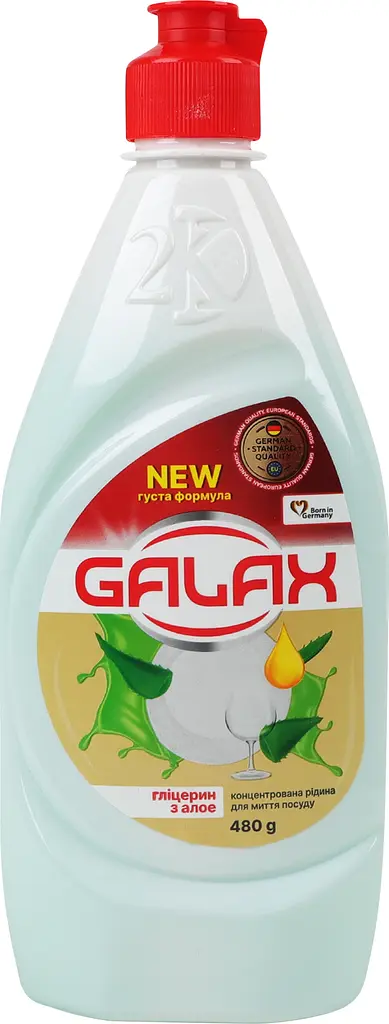 Концентрированная жидкость для мытья посуды Galax Глицерин и алоэ вера обеспечивает максимальную эффективность при минимальном расходе.