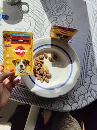 Корм у зручній упаковці по 100 г, вистачає на одне годування. Шматочки м’яса з морквою в соусі виглядають апетитно, запах не різкий. Собака їсть із задоволенням. Гарний варіант як смачне доповнення до раціону, можна давати щодня та комбінувати годування з сухим кормом.