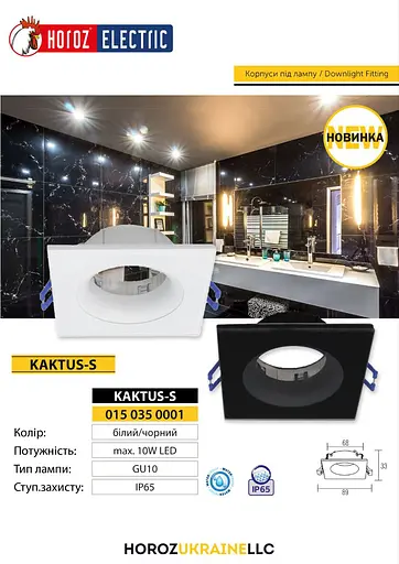Корпус под лампу KAKTUS-S – врезной спот светильника квадратной формы под источник освещения под тип цоколя MR16 и максимальной мощностью до 50 Ватт. Рабочее напряжение колеблется в пределах от 220 до 240 Вольт. Врезное отверстие данной модели – 75мм.