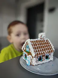 Чудовий будиночок. Деталі прийшли всі цілі. Рівненьки, не потріскані. Дитині (4р) було цікаво склеювати частини, як конструктор, а мамі - прикрашати) Поки глазур висихала, аромат прянику заполонив всю кухню. Головне потрібно мати міксер/кух.комбайн, 1 яйце куряче та бажання.