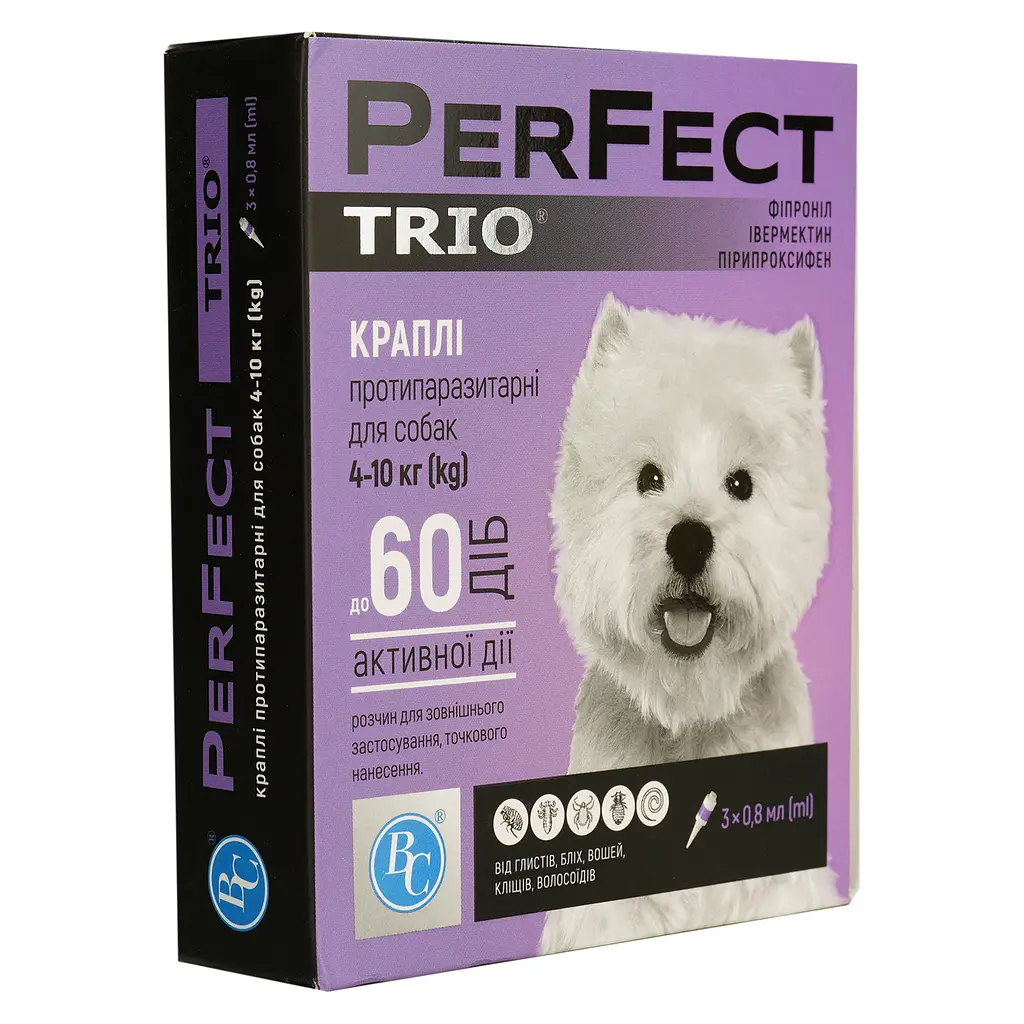 Капли для собак Ветсинтез PerFect Trio содержат три активных ингредиента: фипронил, ивермектин, пирипроксифен. После нанесения на кожу фипронил аккумулируется в эпидермисе, волосяных луковицах и жировых железах животного и оказывает длительное контактное инсекто-акарицидное действие. После нанесения фипронил распределяется по поверхности тела в течение 24 часов. Ивермектин проникает в кровь, распределяется в органах и тканях, вызывает паралич круглых гельминтов и личинок 3 и 4 стадий развития дирофилярии, частично действует контактно на чесоточных и иксодовых клещей.