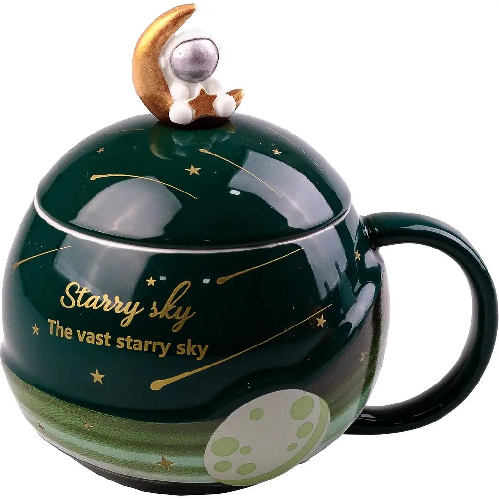 Для того чтобы сохранить ваш напиток теплым, здесь есть керамическая крышка, с отверстием для чайной ложечки, которую венчает маленькая искусно выполненная фигурка космонавта.