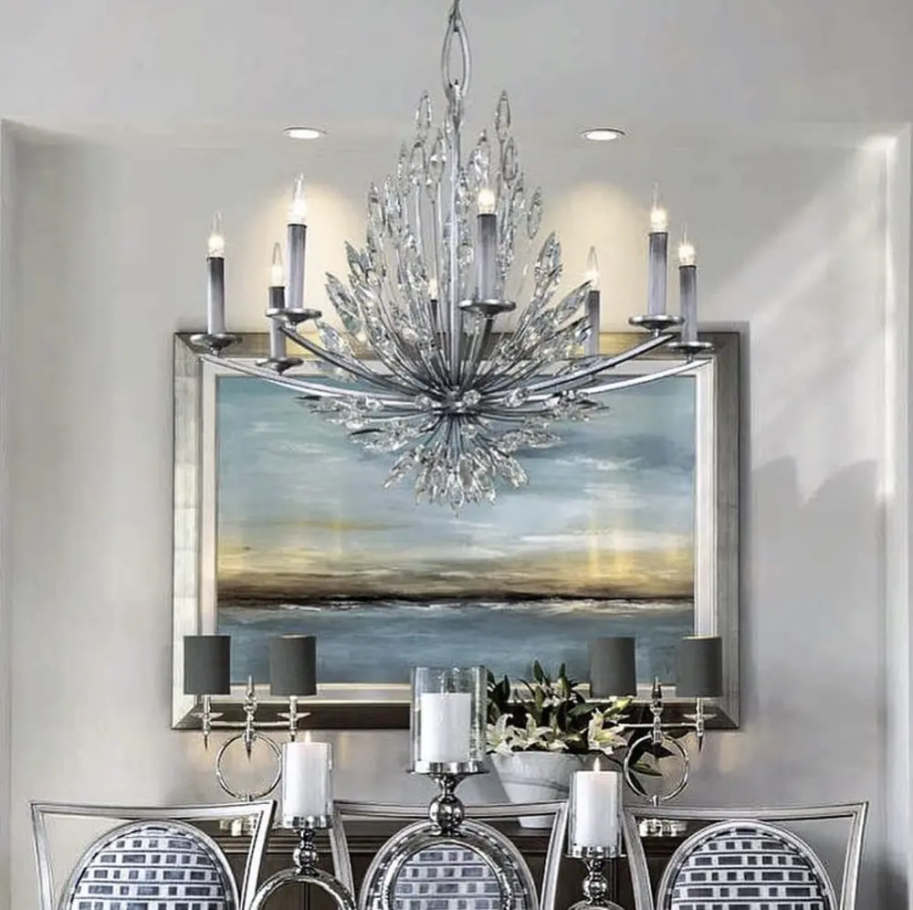 Современная классика в новой интерпретации. Изысканная люстра подсвечник на 6 рожков, элегантно отступающих от корпуса. Корпус люстры покрыт многогранными хрустальными камнями. Источником света являются 15 лампочек (цоколь E14 на 6 ламп и G9 на 9 ламп). Тип выключателя: 65 Серия: MD 8058 Цвет основания: Серый Максимальная высота: 160 см Минимальная высота: 58 см Тип цоколя: E14 Материал основания: Алюминий Цвет хрусталя: Прозрачный Тип крепления: Монтажная планка Количество источников света: 6