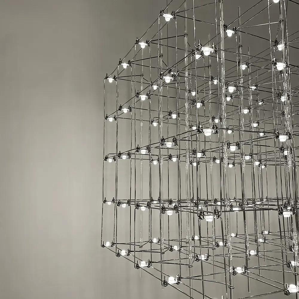 Новая серия геометрических люстр - это произведение искусства, сочетающее современный дизайн и функциональность. Их форма представляет собой вытянутый куб/параллелепипед с прямыми геометрическими линиями, выполненными из металлической проволоки цвета хром. Серия включает три люстры размером: 75х60х60 см, 111х60х60 см и 129х60х60 см. На углах параллелепипеда и на пересечении металлической проволоки размещаются лампочки (они идут в комплекте), которые обеспечивают нейтральный дневной свет, создавая приятную непринужденную атмосферу в помещении. Внутреннее пространство люстры дополнено 4 рядами стеклянных палочек-трубочек длиной 80 см (которые крепятся с помощью силиконовых резинок на расстоянии 10 см от края металлической основы), что придает ей особый шарм и изящество. Потолочная основа размером 25х15х4 см с монтажной планкой 15 см и 4-мя тросами обеспечивает надежное крепление. Такой метод крепления позволит легко установить люстру на необходимой высоте от 65 до 230 см. Эти люстры станут стильным акцентом в любом современном интерьере, придавая ему элегантности и уникальности. Количество источников света: 111 Тип помещения: Люстры для гостиной (в зал) Форма_изделия: Прямоугольник Серия: Cube Цвет основания: Хром Размер потолочной основы: 25х15х4 см Цветовая температура: 4000К Максимальная высота: 230 см Минимальная высота: 65 см Материал основы: Металл Цвет хрусталя: Прозрачный Тип крепления: Монтажная планка Мощность (Вт): 90