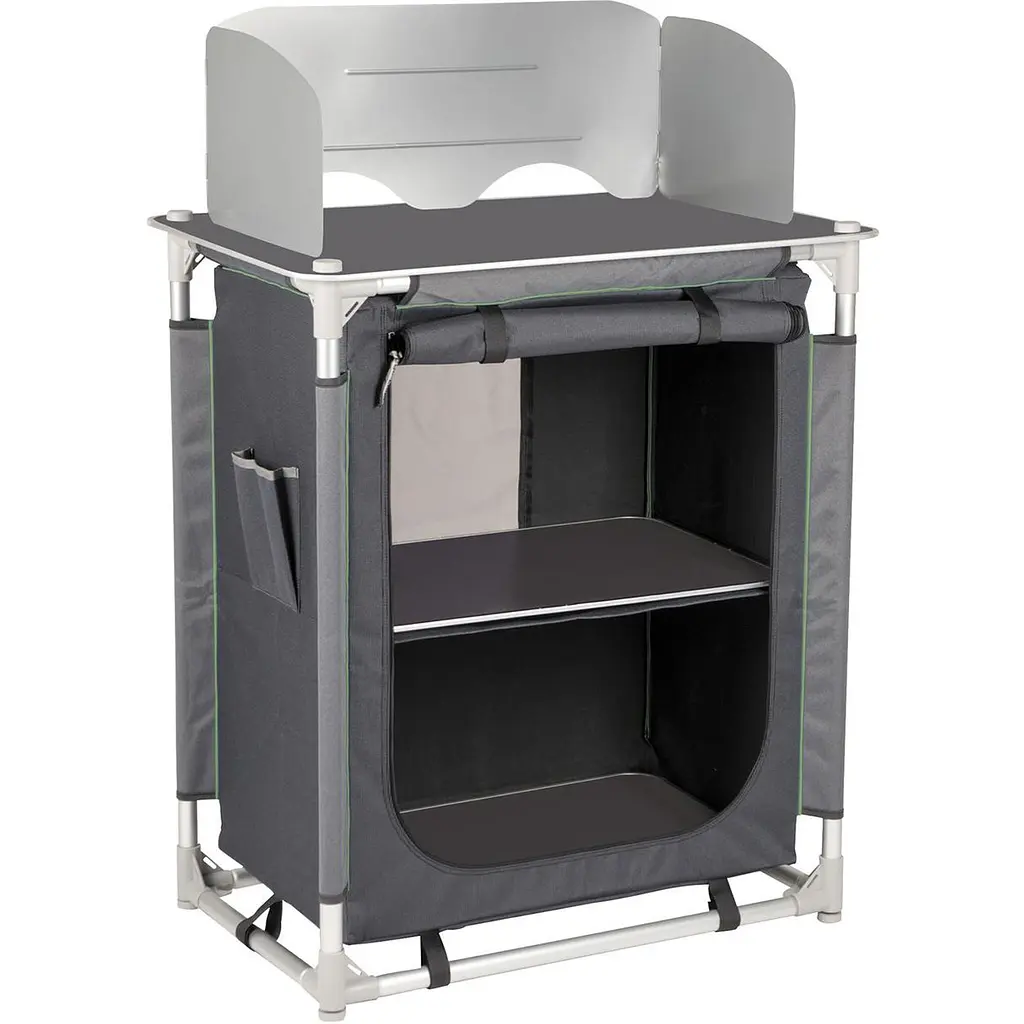 Для хранения посуды и продуктов предусмотрен закрывающийся на молнию текстильный шкафчик с двумя полками из прочного материала полиэстер Оксфорд 600D, который выглядит как настоящая хлопчатобумажная ткань. Боковые карманы-органайзеры помогут разместить кухонные мелочи, так необходимые на каждой кухне.
