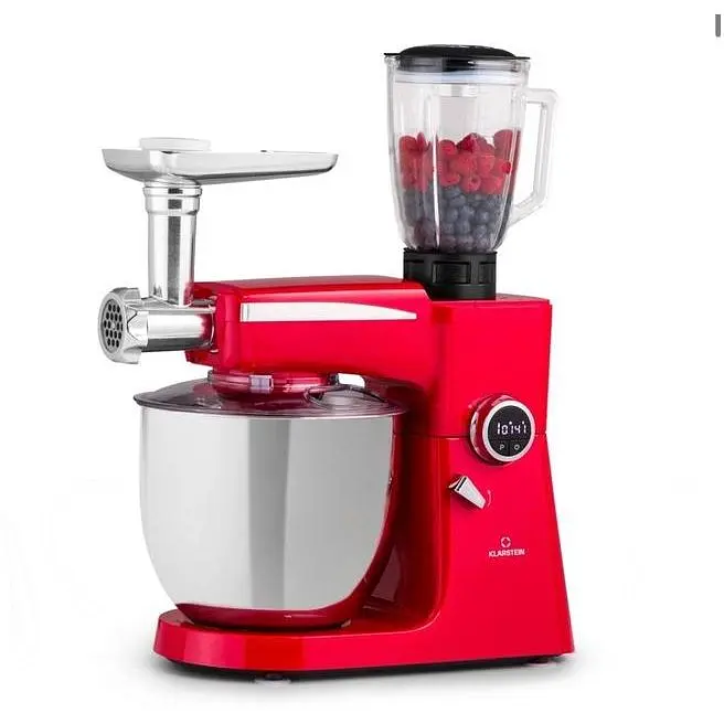 Один на все - размер XL.Кухонный комбайн Klarstein Renata - мощное универсальное чудо для вашей кухни. Очень практичный, он сочетает в себе миксер, миксер и мясорубку в одном устройстве. Благодаря мощности 2000 Вт на 8 уровнях, планетарной системе смешения и гигантской 10-литровой чаше из нержавеющей стали он может справиться со всеми проблемами современного смешения, от тяжелого хлебного теста до рыхлых взбитых сливок. Вы можете приготовить свежие смузи и вкусные коктейли в блендере объемом 1,5л. А для любителей свежего фарша или макарон идеальным дополнением станет насадка для мясорубки из нержавеющей стали. Встроенный цифровой дисплей с поворотной ручкой позволяет легко регулировать скорость и показывает время работы так, чтобы вы могли точно перемешивать. Красочный дизайн вашего нового миксера Klarstein Renata 3-в-1 также является мощным. Это означает, что она будет звездой на вашей кухне даже после использования!
