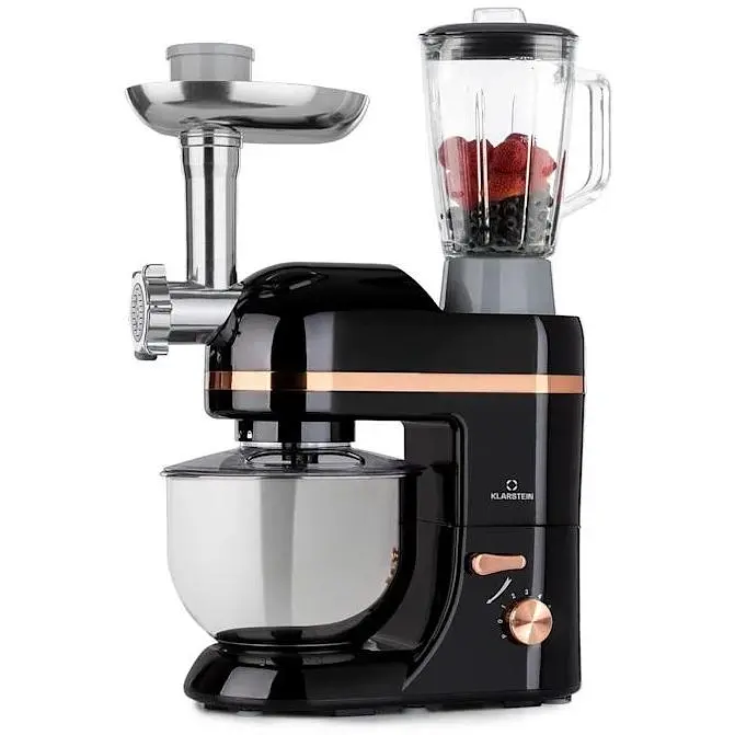 Кухонный комбайн Klarstein Lucia Elegance 3-в-1 - универсал для кухни: с миксером для замешивания, смешивания или взбивания, миксером для измельчения и смешивания и мясорубкой для свежего фарша, домашней колбасы или вкуснейших сортов . макарон. Благодаря мощности 2000 Вт, 6 скоростям и проверенной планетарной системе перемешивания от Klarstein он легко справляется со всеми задачами современной кухни. Даже большие объемы не станут проблемой: благодаря чаше для смешивания из нержавеющей стали объемом 5 литров и чаше блендера объемом 1,5 литра. Кухонный комбайн также впечатляет визуально: благодаря компактному корпусу миксер Klarstein Lucia Elegance прекрасно украсит вашу кухню.