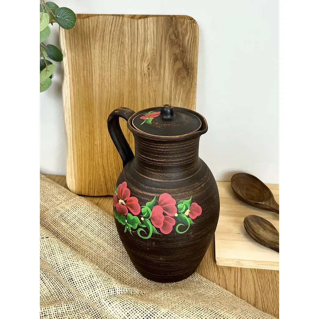 Глиняный кувшин объемом 2,5 литра с яркой росписью «Мак» — отличный выбор для подачи воды, узвара, компота или кваса. Изготовленный вручную из натуральной глины и покрытый пищевой глазурью, он хорошо сохраняет температуру напитков и придает сервировке праздничный вид. Яркие маки символизируют красоту, щедрость и тепло украинской земли.