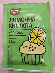 Непогана лимонна кислота від виробника Повна чаша. Досить велика пачка, аж 25 грам. Вистачає надовго. Підходить для різних потреб: і для випічки, і для приготування різноманітних напоїв. Її можна купувати для очищення накипу у чайнику так у харчових потребах. Рекомендуватиму. І буду купувати для своїх потреб.