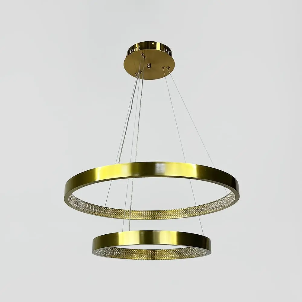 Люстра в латунном корпусе в виде двух колец (Ø 60+40 см) - это стильный акцент для современного интерьера. Ее изысканный дизайн из двух колец, покрытых пластиком с имитацией хрустальной фактуры, создает эффект мягкого и элегантного освещения. Каждое кольцо имеет высоту всего 4 см, что подчеркивает его минималистичный стиль. Встроенные светодиоды работают в трех световых режимах, обеспечивая мощность 82 Вт (42 Вт в теплом и холодном свете). Пластиковые рассеиватели способствуют равномерному, мягкому рассеиванию света, создавая уютную атмосферу. Общую высоту люстры можно регулировать в пределах от 50 до 145 см, а также положение колец можно изменять, что дает возможность адаптировать люстру под любые типы помещений. Идеально подходит для просторных гостиных, столовых, холлов или даже для коммерческих помещений (ресторанов, шоурумов), где нужно создать атмосферу стиля, роскоши и современного вида. Цвет основы: 60 Тип помещения: Люстры для гостиной (в зал) Форма изделия: Кольцо Материал плафона: Пластик Диаметр кольца: 60+40 см Размер потолочной основы: 20х4 см Цветовая температура: 3000–4500–6000К Максимальная высота: 145 см Минимальная высота: 50 см Материал основы: Металл Размер монтажной планки: 17,5 см Тип крепления: Крестовина Мощность (Вт): 82