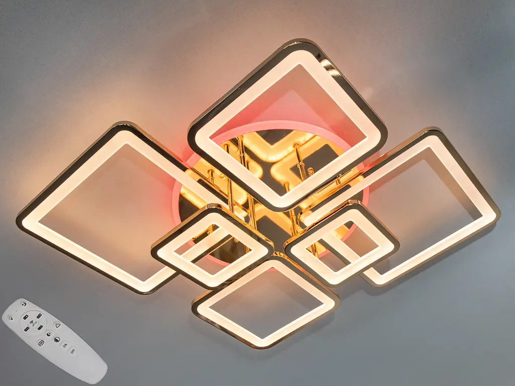 Припотолочная плоская светодиодная люстра с пультом, димером и LED подсветкой на 150 W является настоящим воплощением новейшего дизайна и технологического совершенства. Она идеально подходит для тех, кто хочет купить люстру, способную трансформировать интерьер и придать ему неповторимый характер. Со своей каскадной структурой переплетенных квадратов, светящихся снаружи, эта акриловая светодиодная люстра в золотом цвете напоминает абстрактную скульптуру, замершую в световом танце. Каждый элемент этого осветительного прибора излучает тепло и свет, как будто каждый квадрат – это отдельная история, сплетенная вместе в гармоничную симфонию форм и линий. Дизайн светодиодного светильника, напоминающий одновременно и модернистские произведения искусства, и сложные природные феномены, такие как галактические фигуры, поражает своей утонченностью и артистизмом.