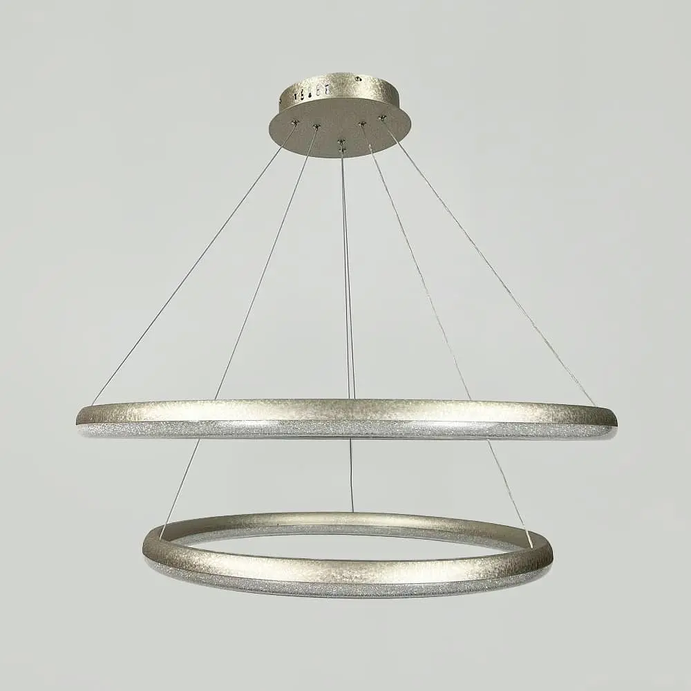 Современная серия кольцевых люстр MJ342 - это изысканное сочетание геометрии, света и металлического блеска. Основу дизайна составляют элегантные кольца из металла в цвете Ice Flower Silver (ледяное серебро) - уникальном оттенке с эффектом перламутрового перелива, который меняется при освещении. Такой цвет придает люстре эффект изящной прохлады и благородного сияния. Серия представлена в нескольких вариантах: одноярусная модель диаметром 65 или 83 см, а также двухярусная композиция 65+83 см, создающая объемный и динамичный силуэт. Под фактурным пластиковым рассеивателем скрыты светодиоды с тремя режимами освещения - теплым, нейтральным и холодным. Регулируемая высота подвеса позволяет использовать люстру как в просторных, так и в комнатах с невысокими потолками. MJ342 прекрасно дополнит гостиную, спальню, столовую или современный холл, придавая интерьеру световую легкость и изысканный блеск. Тип выключателя: 83 Тип помещения: Люстры для гостиной (в зал) Форма_изделия: Кольцо Серия: MJ342 Цвет основы: Ледяное серебро Материал плафона: Пластик Размер потолочной основы: 25х5 см Цветовая температура: 3000–4500–6000К Максимальная высота: 125 см Минимальная высота: 60 см Материал основания: Металл Размер монтажной планки: 20 см Тип крепления: Крестовина Мощность (Вт): 63