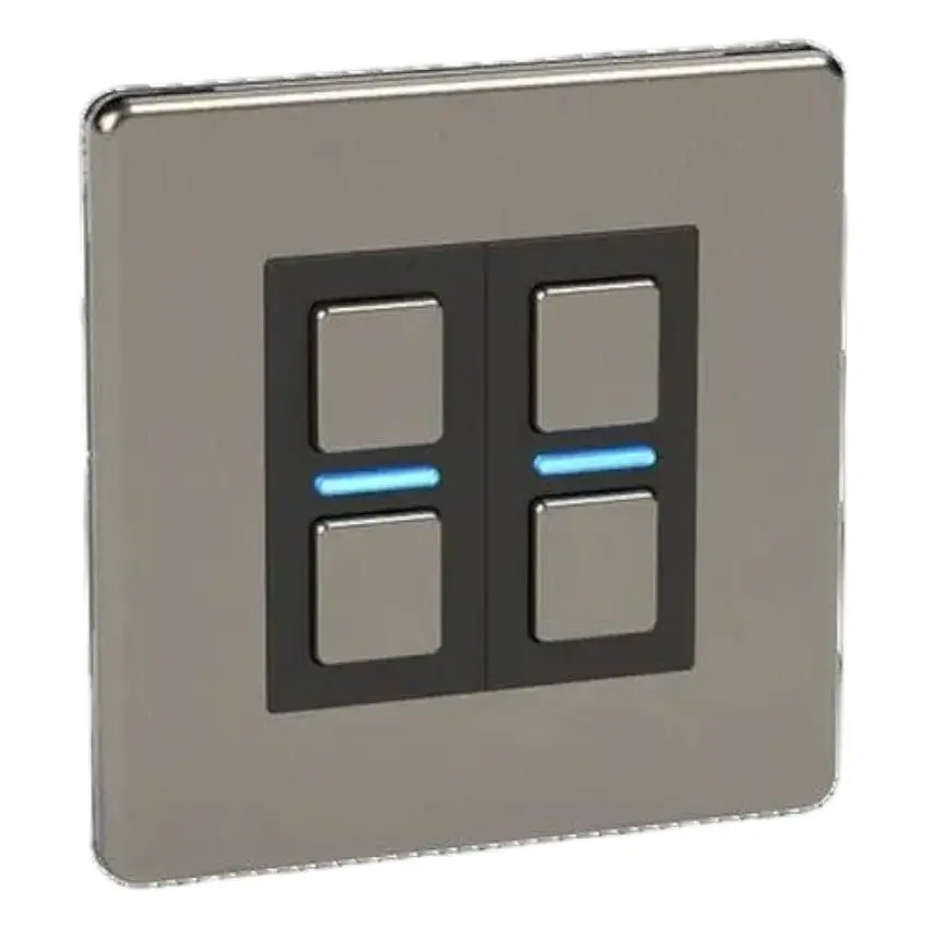 Что в коробке? Lightwave Smart Dimmer (2 Gang) из нержавеющей стали, 10 мм распорка, 2 x фиксирующие винты, инструкция по эксплуатации