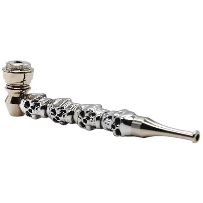Курительная трубка N26 Skull. Люлька защищена от разного рода природных стихий, таких как, например, внезапные порывы ветра, которые могут в мгновение ока сдуть ваш стафф. Для этого в конструкции предусмотрена крышка для чаши на резьбе - наполняете чашу стаффом, закручиваете сверху крышкой, таким образом появляется закрытый контейнер, а сверху расположен небольшой разъем для розжига. Этот конструктив позволяет не только избежать ожогов в случае случайного просыпания, но и не потерять никакой крошки во время неожиданно налетевшего неожиданного потока ветра. Эта трубочка длиной 128 мм. изготовлена из облегченного металлического сплава и полностью разбирается, что позволяет легко ее чистить. Элементы закреплены между собой с помощью резьбы. Вставка в виде хромированных черепов придает аксессуару интересный внешний вид, диаметр чаши 15 мм.