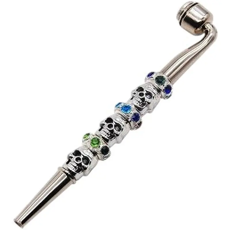 Курительная трубка N27 Skull Rhinestones 178 мм. Люлька защищена от разного рода природных стихий, таких как, например, внезапные порывы ветра, которые могут в мгновение ока сдуть ваш стафф. Для этого в конструкции предусмотрена крышка для чаши на резьбе - наполняете чашу стаффом, закручиваете сверху крышкой, таким образом появляется закрытый контейнер и сверху расположен небольшой разъем для розжига. Этот конструктив позволяет не только избежать ожогов в случае случайного просыпания, но и не потерять никакой крошки во время неожиданно налетевшего неожиданного потока ветра. Эта трубочка длиной 178 мм. изготовлена из облегченного металлического сплава и полностью разбирается, что позволяет легко ее чистить. Элементы закреплены между собой с помощью резьбы. Вставка в виде хромированных черепов и драгоценных камней придает аксессуару интересный внешний вид, диаметр чаши 15 мм.