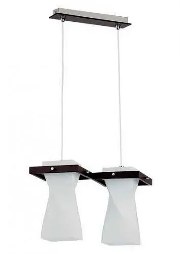 Люстра подвес серии Tequila производства компании ALFA (Польша); Материалы: металл, дерево, стекло; Цвет основания: венге; Цвет плафонов: белый матовый; Высота: 40-90 см; диаметр: 42 см; лампы: 2х Е27х 60 Вт.