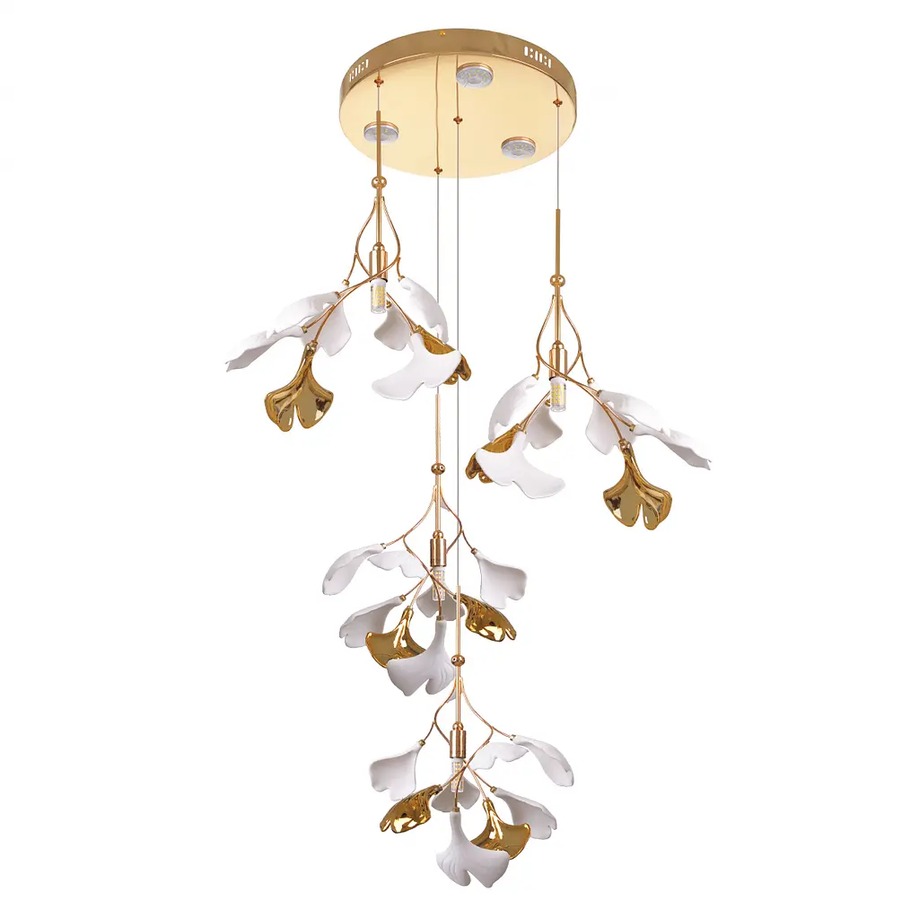 Люстра флористика 531S/4 E14 GD - это модный светильник со стильным и необычным дизайном белого и золотистого цвета. Модель подойдет для спальни, гостиной или зала с современным интерьером. Светильник представляет собой три люстры-подвески, которые сформированы из декоративных элементов в виде белых лепестков цветов, выполненных из керамики и золотых листьев. Декоративные элементы расположены на золотистого цвета изогнутых ветках-держателях. Подвесы выходят из основания, которое крепится к потолку с помощью монтажной планки. Габариты люстры - 750 х 250 х 1100 мм. В качестве источников света используются три лампочки с цоколем Е14 мощностью 40 Вт. Это могут быть светодиодные, энергосберегающие или лампы накаливания. Применение светодиодных позволит значительно уменьшить расход электроэнергии. К тому же светодиодные элементы имеют длительный срок работы, почти не нагреваются, излучают комфортный свет, не вредят здоровью и не требуют специальной утилизации. Люстра предназначена для эксплуатации в сети переменного тока с номинальным напряжением 220 В. Уровень защиты корпуса от попадания внутрь пыли и влаги - ИР20.