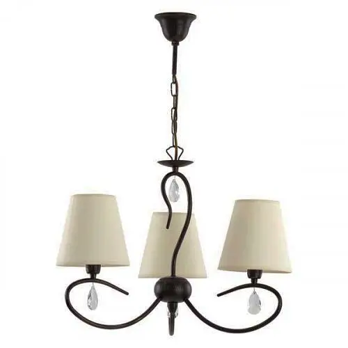 Люстра классическая с абажурами серии Bali Premium производства компании ALFA (Польша); Материалы: металл, текстиль, хрусталь; Цвет основания: коричневое с золотой патиной; Цвет абажуров: бежевый; Высота: 50-70 см; диаметр: 46 см; лампы: 3 х Е14 х 60 Вт.