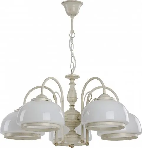 Люстра серии Paris White производства компании ALFA(Польша); Материалы: металл; Цвет основания: белый с золотой патиной; Цвет плафонов: белый; Высота: 60-76 см; диаметр: 62 см; лампы: 5 х Е-27 х 60 Вт.