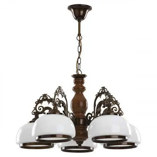 О товаре Классическая люстра серии Parma производства компании ALFA(Польша);Материалы: металл, дерево, стекло;Цвет основы: коричневый;Цвет плафонов: белый;Высота: 64 см; диаметр: 57 см; лампы: 5 х Е27 х 60 Вт.