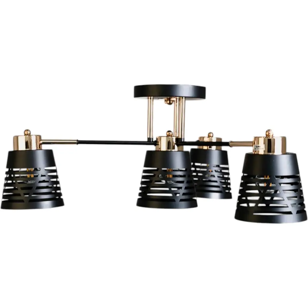Люстра LK-737C/4 E27 BK+FG - это воплощение современного дизайна и высокого качества. Изготовлена из прочных материалов и прослужит вам долгие годы. Люстра имеет металлический корпус бронзового цвета с черными элементами. На четырех горизонтальных, перекрестных, прямых держателях расположены черные плафоны конической формы, представляющие собой решетчатую конструкцию, что придает ей интересный современный характер. В качестве источника света используются четыре лампы с цоколем Е27 и максимальной мощностью 60Вт. Она дает возможность использования различных источников света, таких как светодиодные лампы, энергосберегающие лампочки или накаливания, что делает ее универсальным выбором. Очень эффектно здесь будет смотреться лампа Эдисона. Эта люстра легко монтируется и интегрируется в интерьер, обеспечивая равномерное и приятное освещение. Идеально подходит для использования в жилых помещениях, офисах, магазинах и других коммерческих пространствах. Подойдет для освещения квартиры, кафе, хостела или шоу-рума. Она впишется как в классический, так и в современный интерьер.