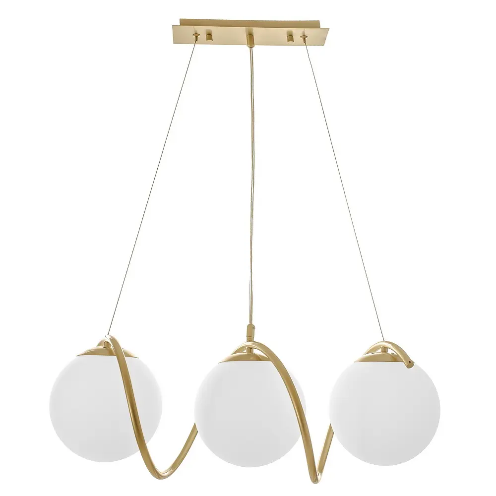 Данный светильник изготовлен из металла и стекла. К металлическому фигурному каркасу золотистого цвета прикреплены три плафона. Плафоны стеклянные, белого цвета, выполнены в форме шара. Высоту осветительного прибора можно изменять. Для работы нужно использовать три лампы с цоколем Е27 (разогревающая, энергосберегающая, светодиодная). Высота осветительных приборов легко регулируется, ее можно изменить, подняв или опустив цепь, веревку или трос. Таким образом люстра будет висеть на большей или меньшей высоте в зависимости от ваших предпочтений. На всю продукцию действует гарантия. Высота осветительных приборов легко регулируется, ее можно изменить, подняв или опустив цепь, веревку или трос. Таким образом люстра будет висеть на большей или меньшей высоте в зависимости от ваших предпочтений.