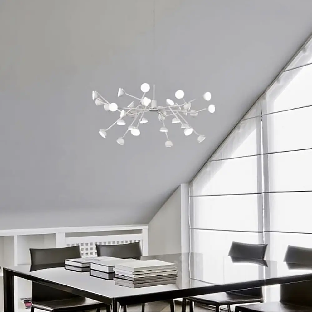 Стильная люстра в современном дизайне, исполненная в форме молекулы, станет идеальным выбором для вашего интерьера. Металлический корпус в белом цвете подчеркивает сдержанную элегантность и придает простор современной эстетике. Дизайн с многочисленными плафонами напоминает молекулярную структуру, создавая эффект легкости и динамики, гармонично впишущийся в стиль минимализм, лофт или хай-тек. Плафоны оснащены встроенными светодиодами с нейтральной температурой света (4000K), что обеспечивает комфортное и естественное освещение. В центральной части люстры встроен цоколь GU10 под одну лампу. Белая люстра доступна в вариантах с 18, 24, 30, 36 и 42 плафонами, что позволяет подобрать оптимальную модель в зависимости от размера помещения: На 18 плафонов (диаметр 60 см, 36 Вт) подходит для площади до 12 м² На 24 плафона (диаметр 70 см, 48 Вт) - до 16 м² На 30 плафонов (диаметр 75 см, 60 Вт) - до 20 м² На 36 плафонов (диаметр 80 см, 77 Вт) - до 22-25 м² На 42 плафона (диаметр 90 см, 84 Вт) - до 28 м² Цвет корпуса можно выбрать из двух вариантов: классический черный или универсальный белый, позволяющий легко интегрировать люстру в любой интерьер. Серия также включает настенные бра на 8 плафонов, которые гармонично дополнят композицию освещения в вашем доме. Эта люстра станет ярким акцентом в вашем доме, офисе или коммерческом пространстве, придавая не только свет, но и стиль! Количество источников света: 80 Серия: SP 06 Цвет основы: Белый Цветовая температура: 4000K Максимальная высота: 225 см Минимальная высота: 39 см Тип цоколя: LED-модуль Размер плафона: 4 см Размер монтажной планки: 10 см Тип крепления: Монтажная планка Мощность (Вт): 77 w