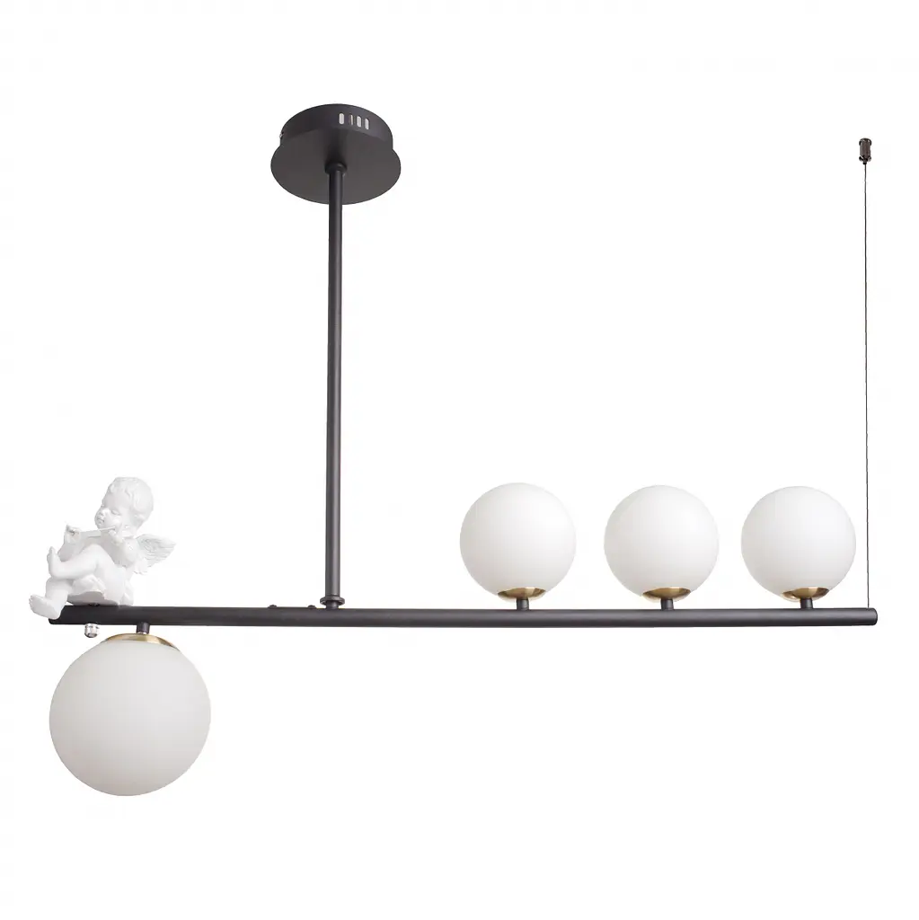 Оригинальная потолочная люстра на 4 лампочки BR-01 655S/3 G9 + 1 E27 BK имеет необычный сюжетный дизайн. Металлический корпус осветительного прибора состоит из двух перпендикулярных штырей, которые отходят от основания. На них прикреплены 4 плафона и фигурка янгелятка. Плафоны стеклянные, закрытого типа, 3 расположены сверху металлического корпуса, один - внизу. Для работы светильника нужны 3 галогенные или светодиодные лампочки с цоколем G9 и одна лампа с цоколем Е27. Подойдут светодиодные, энергосберегающие и лампы накаливания. Такая люстра предназначена для освещения жилых помещений, кафе, ресторанов. Ее можно установить в спальне или гостиной. Люстра прекрасно впишется в классический и современный интерьер комнат. Устанавливают люстру с помощью монтажной планки. Плафоны прекрасно распределяют световой поток, направляя лучи в разные стороны. Высота люстры - 67 см, ее рекомендуют устанавливать в помещениях с высокими потолками.
