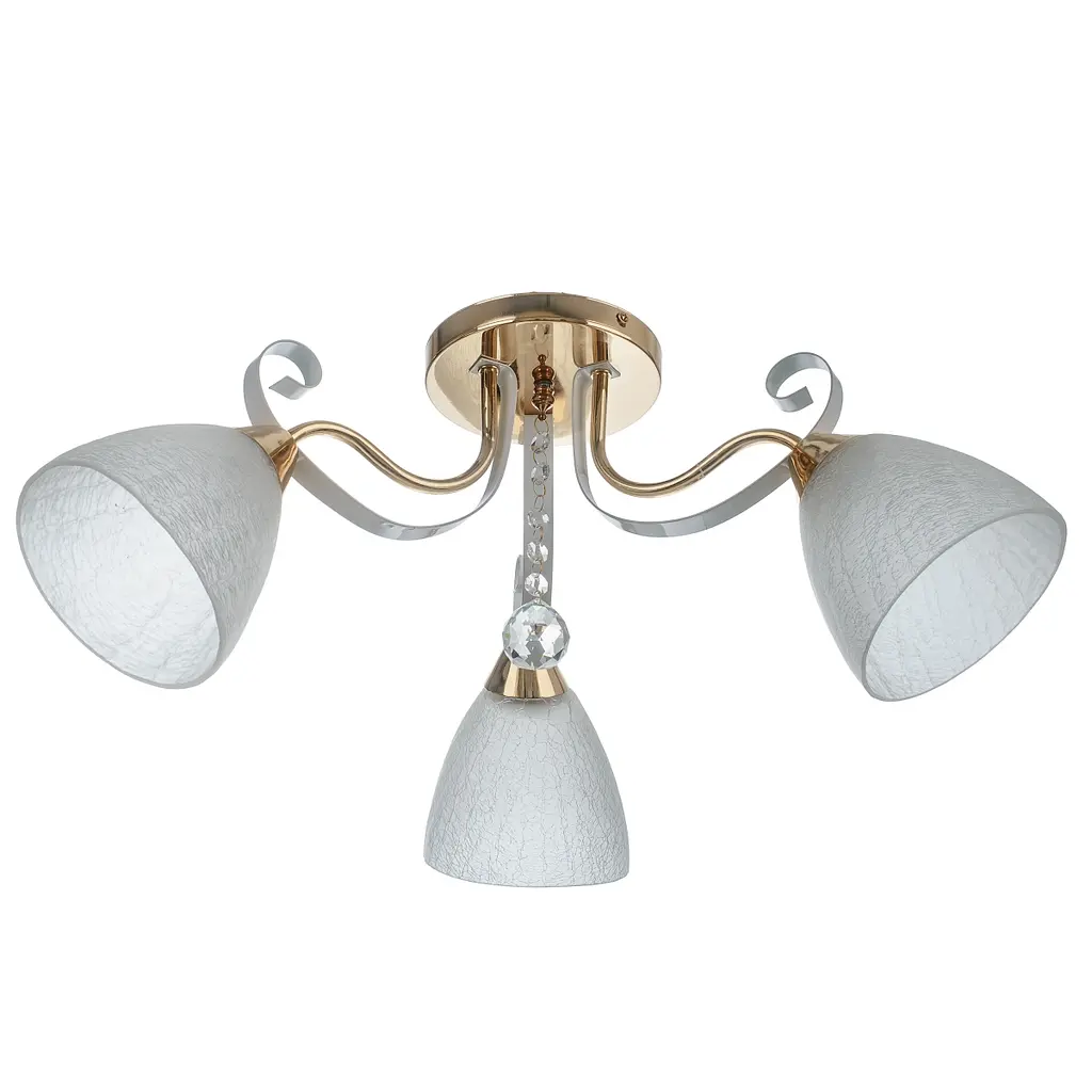 Скромная, но со вкусом люстра подойдет для любого интерьера. Изделие создаст уютное освещение и порадует своим легким и светлым дизайном. Осветительный прибор изготовлен из металла золотистого цвета с гнутыми элементами декора. Плафоны сделаны из белого стекла. Изделие декорировано стеклянной подвеской. Крепится люстра с помощью монтажной планки. Для работы изделия требуется 3 лампы с цоколем E27. Подойдут лампы любого типа (раскаленные, светодиодные, энергосберегающие). Осветительный прибор будет хорошо смотреться в гостиной, прихожей или спальне.