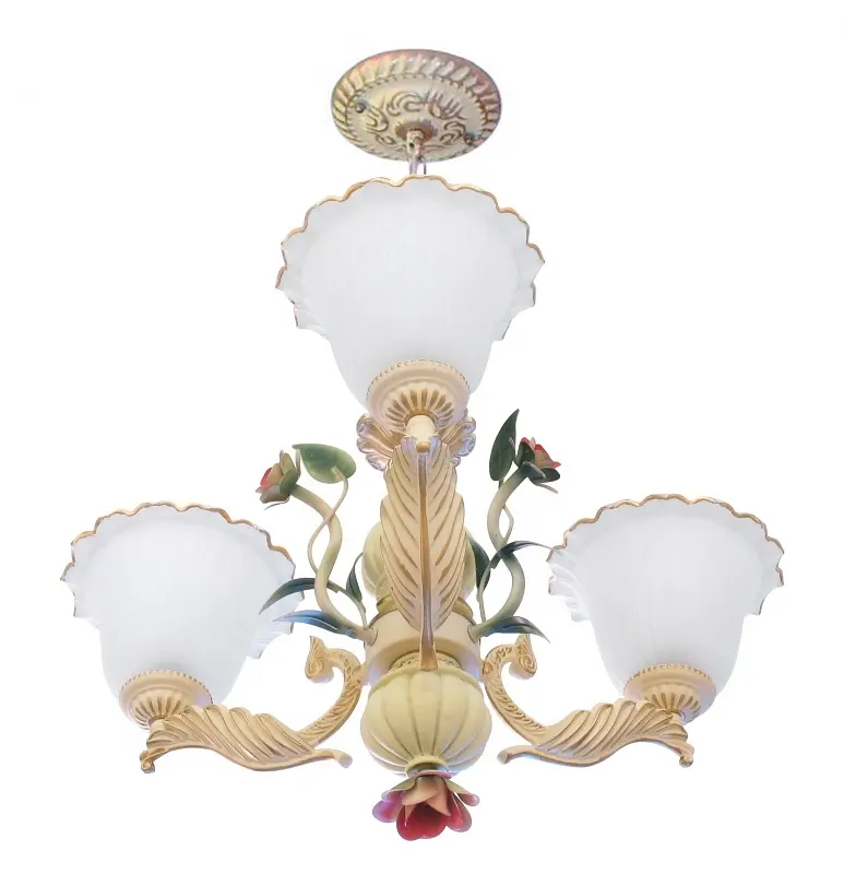 Для стиля флористика характерны такие декоративные элементы, как цветочные бутоны, стебли, лепестки. Необычайно нежная и красивая люстра в стиле флористика BKL-037S/3 порадует каждую хозяйку своим дизайном. При изготовлении люстры мастера выигрышно совместили два материала: стекло и металл. Люстра имеет пять стеклянных плафона с матовым покрытием. Благодаря матовому покрытию свет будет мягким и приятным для восприятия. Плафоны в форме чаши с фигурными краями направлены вверх. Каркас декорирован маленькими цветочками. С помощью металлической цепи можно самостоятельно регулировать высоту люстры. Люстра рассчитана на пять лампочек с цоколем Е27 мощностью 60 Вт.
