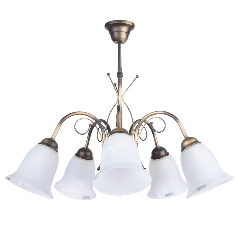 Еще в начале прошлого века наличие люстры в доме считалось признаком высокого достатка и роскоши. Сегодня же люстрой никого не удивишь. Впрочем, порой люстра является главной изюминкой интерьера. Позвольте и мы вам предложить качественный осветительный прибор - подвесную люстру от ТМ Brille BKL-470S/5 E27 BR. Она изготовлена из металла и стекла, выполнена в классическом стиле. К металлическому фигурному каркасу прикреплены пять стеклянных матовых плафонов белого цвета. Форма плафонов имитирует форму колокольчиков, направлены они в разные стороны. Для работы люстры необходимо использовать пять лампочек с цоколем Е27. Вешать люстру лучше всего над обеденным столом или над зоной приема гостей.