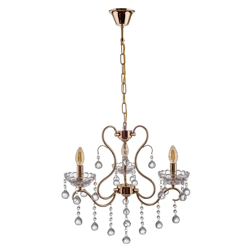 Простота, лаконичность, изящные формы, изогнутые линии - все это сочетает в себе люстра BCL-666S/3 E14 FGD от ТМ Brille. Подходит она для классических интерьеров, размещать ее необходимо в помещении с высокими потолками, высота регулируется с помощью металлической цепи путем удаления или добавления звеньев. Осветительный прибор рассчитан на три лампы с цоколем Е14 мощностью 60 Вт. Лучше всего подойдут лампы свечовидной формы, поскольку конструкция люстры имитирует старинный канделябр. Дополнительно каркас декорирован стеклянными подвесками с гранеными камешками, в включенном состоянии люстры они переливаются разноцветными красками. Несмотря на свою классичность, осветительный прибор достаточно легкий, простой и стильный. Он не отягостит внешний вид комнаты, придаст ей изюминку.