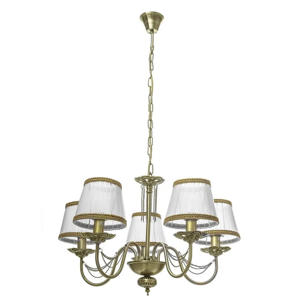 Люстра BKL-662S/5 E14 AB будет прекрасно смотреться в просторном помещении с высоким потолком. К металлическому каркасу цвета бронзы прикреплены тканевые абажуры белого цвета. Плафоны в форме срезанного конуса дополнены коричневой тканевой каймой. Вы можете регулировать высоту люстры с помощью добавления или удаления звеньев на цепи. Для работы люстры требуется 5 лампочек с цоколем E14. Подходят светодиодные, энергосберегающие или лампочки накаливания. Рекомендуем использовать светодиодные лампы, так как они не нагреваются, экономят электроэнергию и не содержат вредных веществ. Изысканная подвесная люстра станет украшением интерьера в классическом стиле.