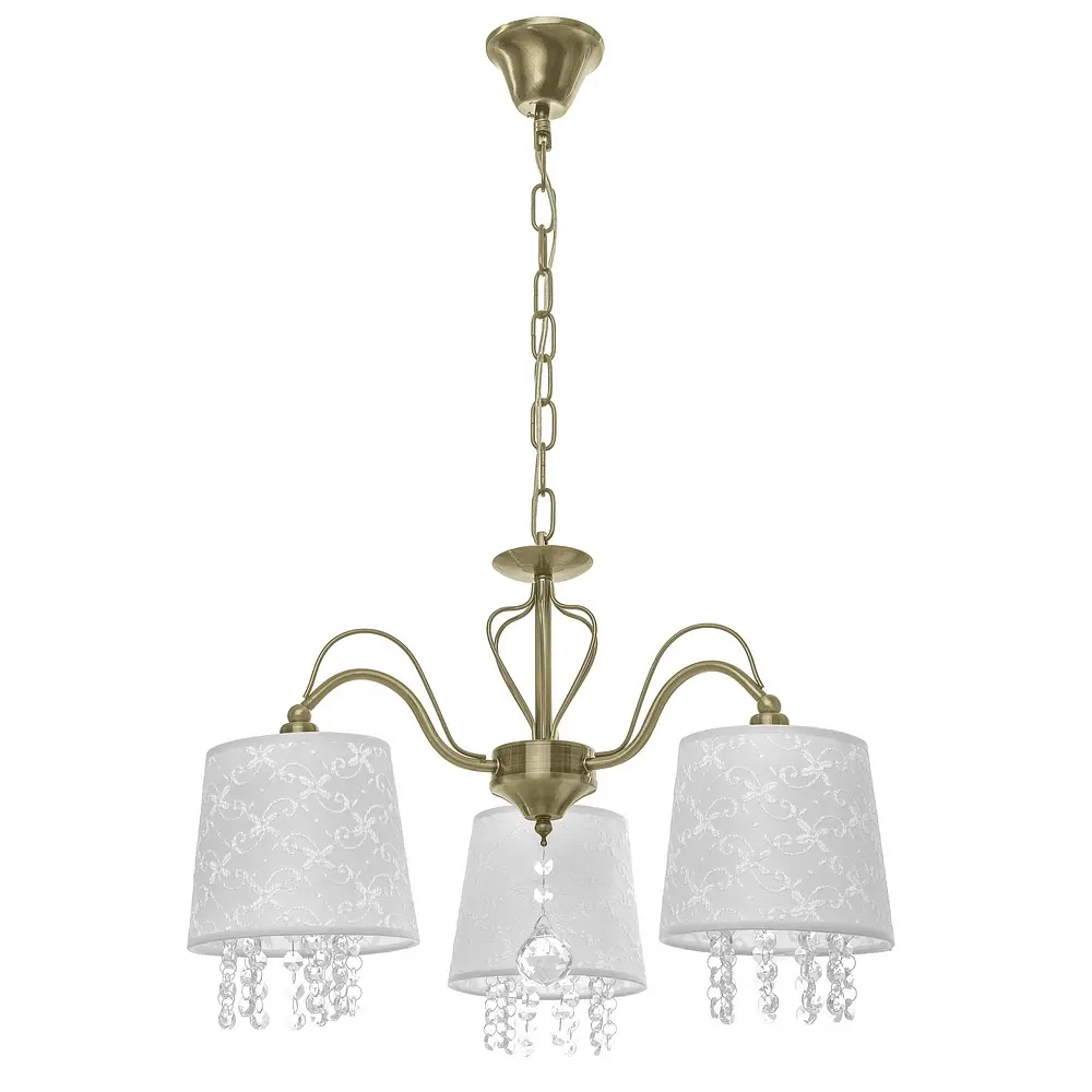 Нарядная люстра BKL-670S/3 E14 AB в классическом стиле придется по вкусу людям, которые ищут, прежде всего, уют и практичность в предметах интерьера. Данный светильник послужит также как самостоятельный предмет интерьера, так как его дизайн богат украшениями. Материалами для изготовления люстры послужили металл и ткань. Конструкция состоит из металлического фигурного каркаса цвета бронза, к которому прикреплены три тканевых плафона белого цвета. Декорированы они едва заметным легким узором. Дополнительно абажуры украшены подвесками со стеклянными гранеными камешками. Ткань поглощает излучаемый лампами свет, придавая ему мягкость и тусклость. Высоту осветительного прибора можно регулировать с помощью металлической цепи путем удаления или добавления звеньев. Для работы необходимо использовать три лампы с цоколем Е14 (раскалительная, энергосберегающая, светодиодная). Высота осветительных приборов легко регулируется, ее можно изменить, подняв или опустив цепь, веревку или трос. Таким образом люстра будет висеть на большей или меньшей высоте в зависимости от ваших предпочтений. Высота осветительных приборов легко регулируется, ее можно изменить, подняв или опустив цепь, веревку или трос. Таким образом люстра будет висеть на большей или меньшей высоте в зависимости от ваших предпочтений.