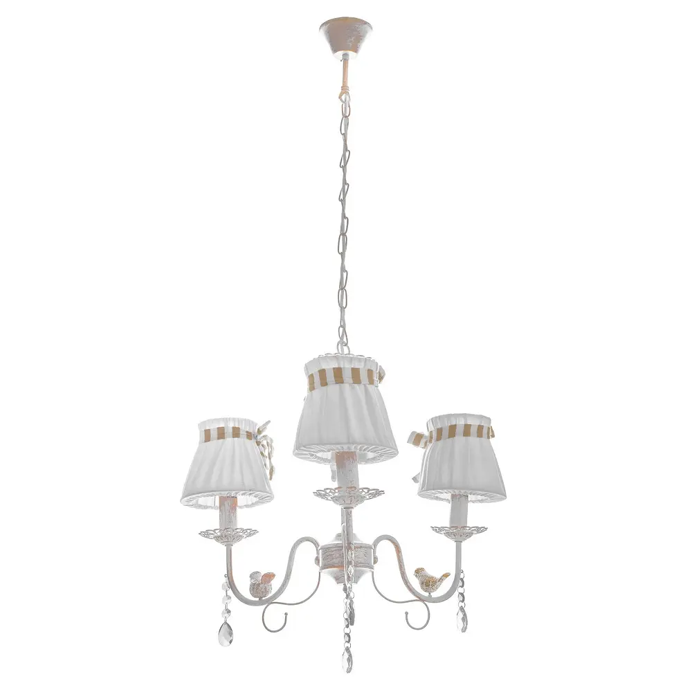 Люстра с абажурами BKL-660S/3 E14 WH/G - эффективный инструмент для приглушения освещения с целью создания максимально уютной атмосферы в доме. Наиболее подходящим местом для ее монтажа является спальня. Конструкция представлена в виде металлического каркаса белого цвета с вкраплениями золотистого, к которому прикреплены три плафона. Плафоны тканевые, белого цвета, декорированы тканевыми бантами. Дополнительно каркас украшен подвесками со стеклянными прозрачными гранеными камешками. Для работы необходимо использовать три лампочки с цоколем Е14 (раскалительная, энергосберегающая, светодиодная). Высоту можно регулировать.